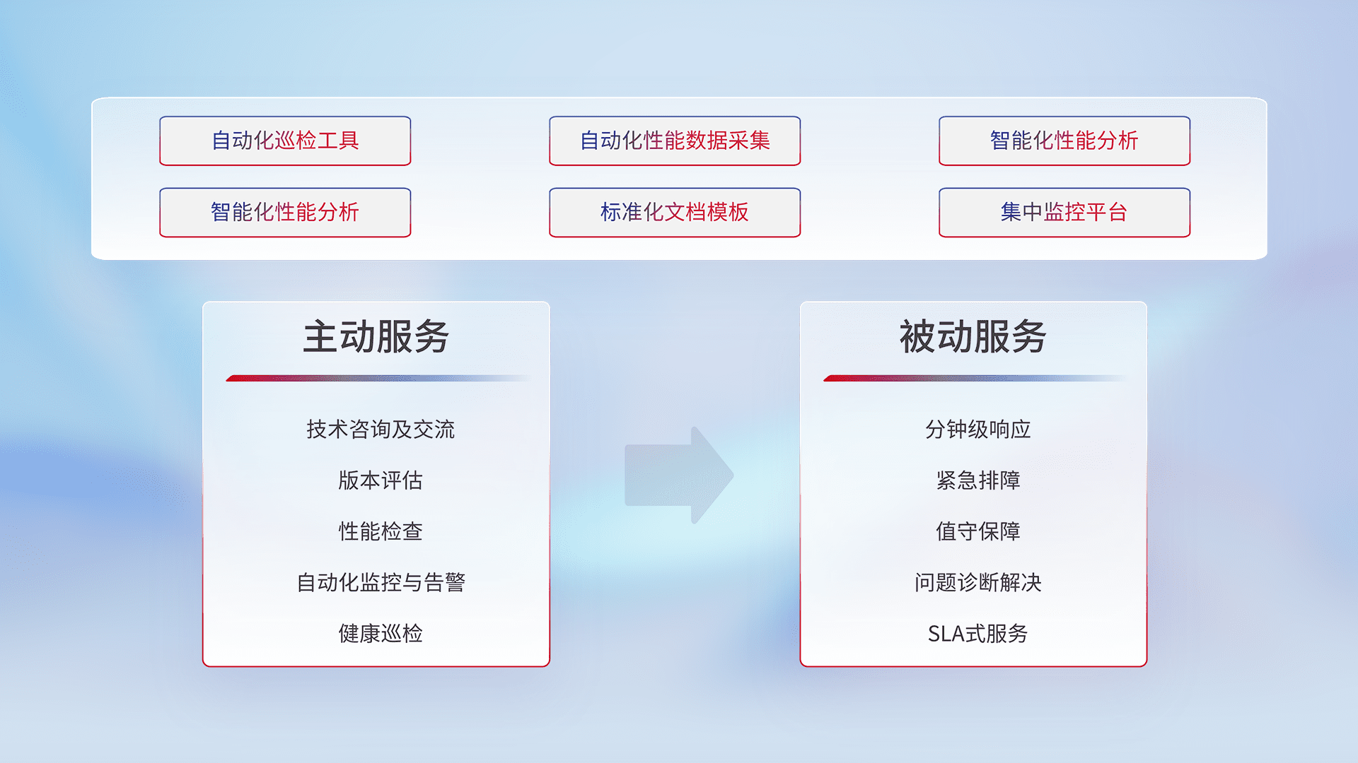 智能化工具和标准化文档,,,保障服务质量,,,,提供主动服务(包含技术咨询、、、版本评估、、、、性能检查、、、自动化监控与告警、、、、健康巡检)和被动服务包含(分钟级响应、、紧急排障、、、、值守保障、、、问题诊断解决、、SLA服务)。。。